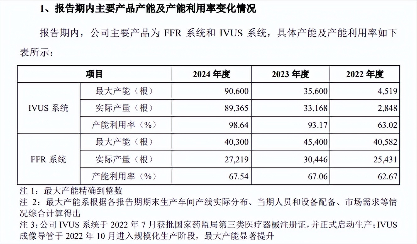 最近三年,北芯生命IVUS系统的产能利用率分别为63.02%、93.17%、98.64%,而FFR系统的产能利用率分别为626.67%、67.06%、67.54%。2024年,两大系统产品的最大产能分别为90,600根、40,300根,合计130,900根,如今却要新增超110万根,新增产能的消化问题需要关注,上交所要求公司说明募投项目扩建产能的合理性。