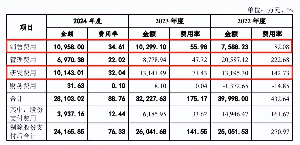 同时期的销售费用上升明显,分别为7,588.23万元、10,299.10万元、10,958.00万元,费用率分别为82.08%、55.98%、34.61%,2024年已经实现对研发费用的反超。