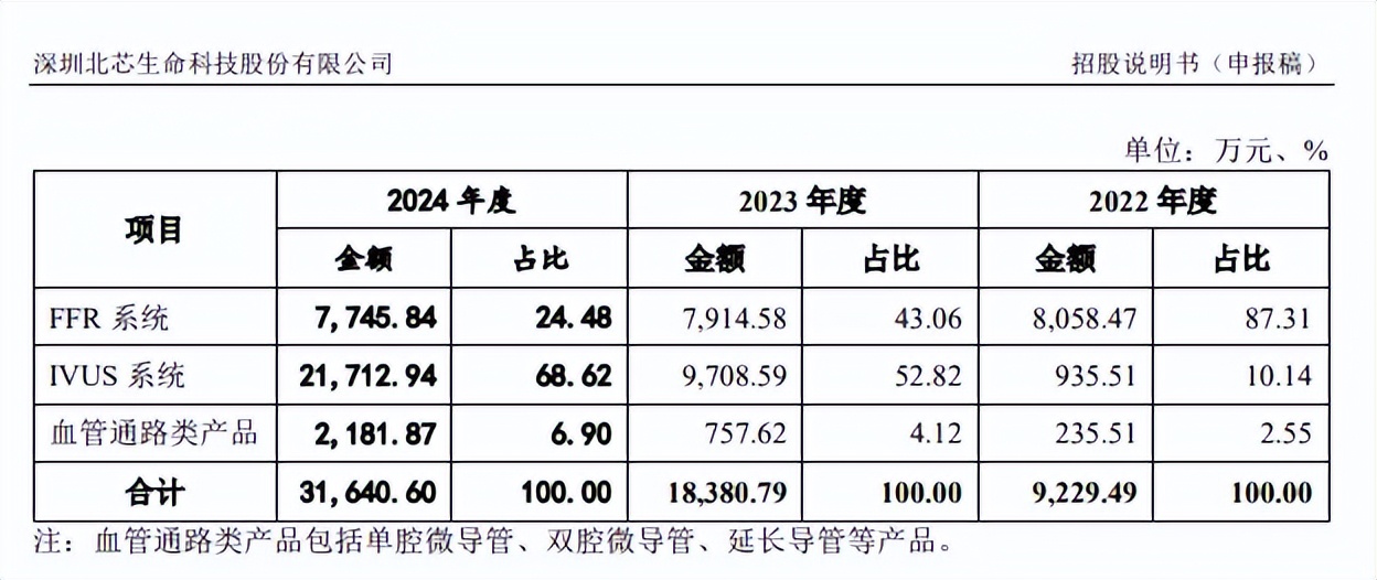 据短平快解读了解,北芯生命的收入主要以IVUS成像导管和FFR压力微导管销售收入为主,2024年占主营业务的比例分别为24.48%、68.62%。