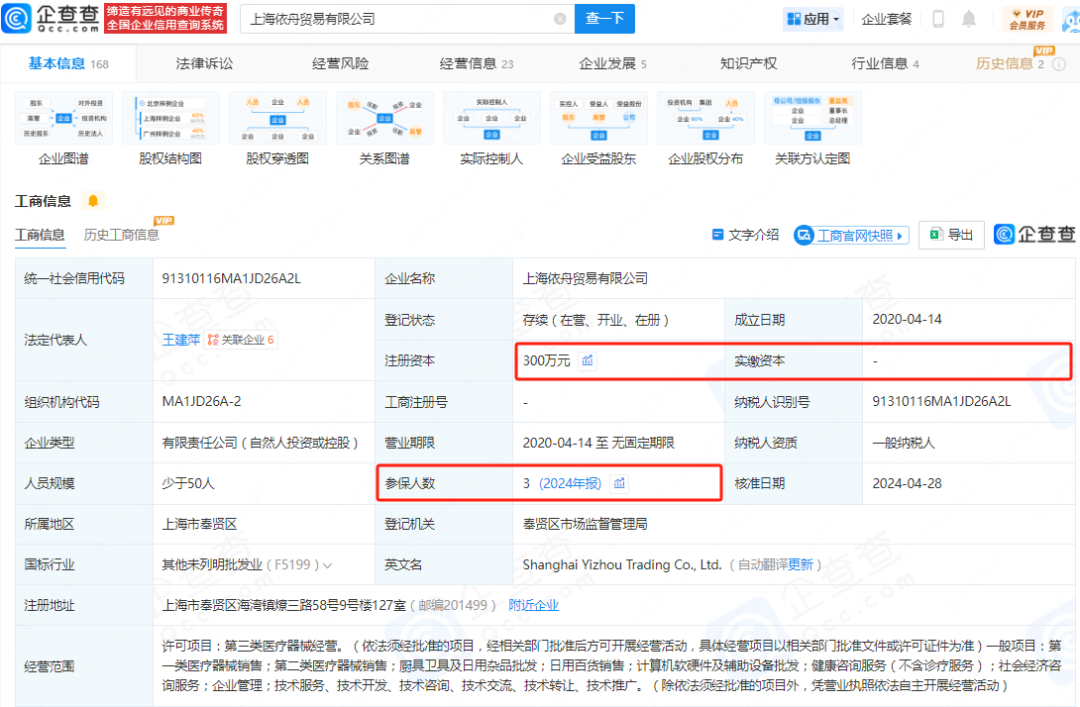企查查显示,依舟贸易成立于2020年4月,郭洪楠、王建萍分别持股70%、30%,注册资本多次变更,分别为200万元、2000万元、300万元,但均没有实缴资本,最近四年参保人数分别为1人、2人、3人、3人。