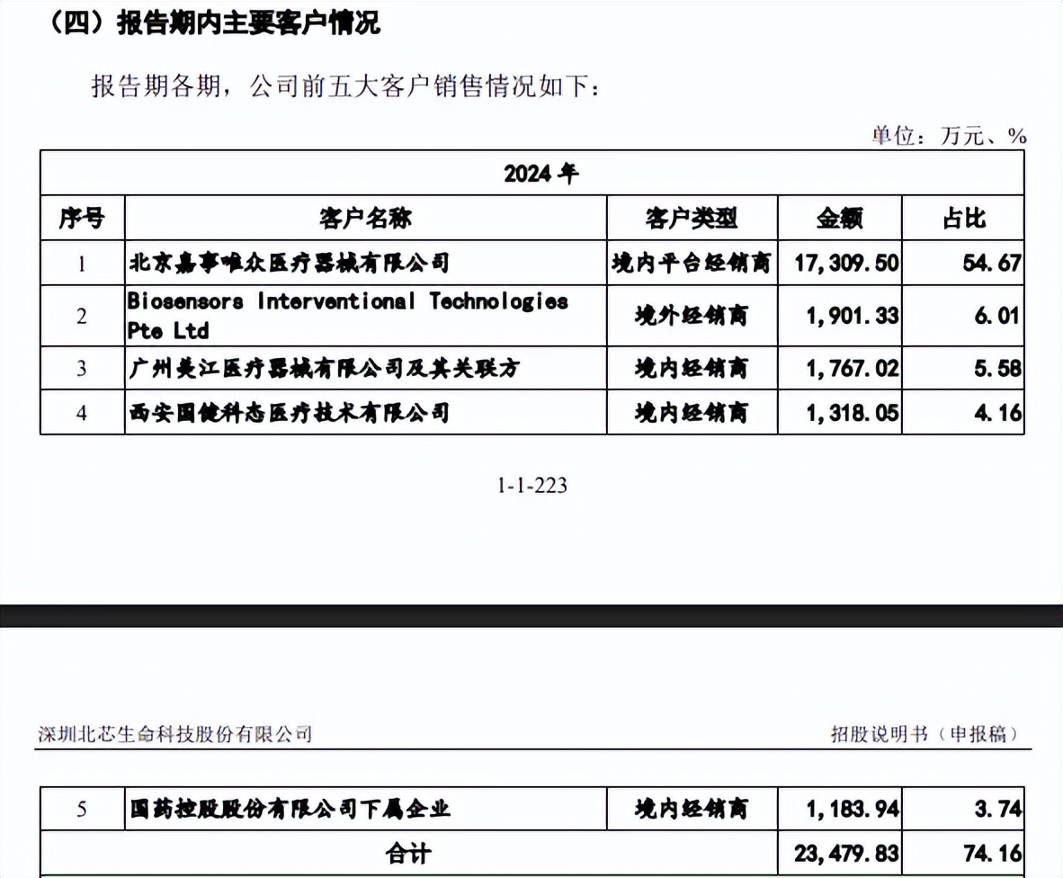 客户集中度高。最近三年,北芯生命对前五大客户的销售额分别为7,574.08万元、11,451.27万元、23,479.83万元,占比分别为81.92%、62.24%、74.16%,在2024年,公司对第一大客户北京嘉事唯众医疗器械有限公司的销售额为17,309.50万元,占比高达54.67%。