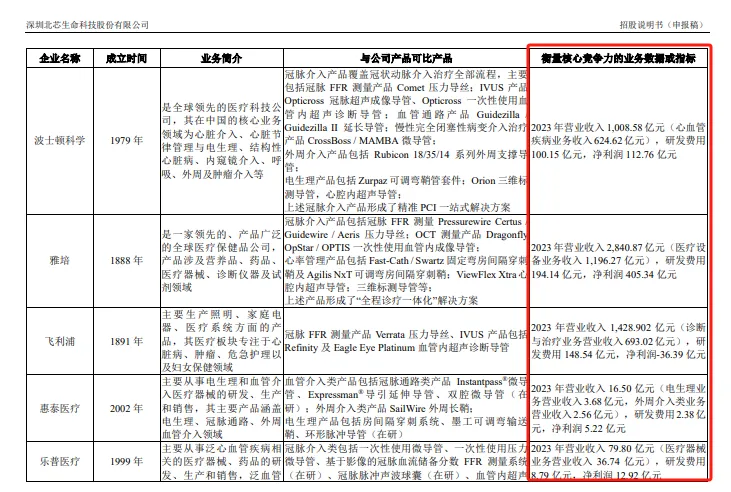 与北芯生命具有可比业务和产品的主要上市公司为波士顿科学、雅培、飞利浦和乐普医疗,2023年的收入分别为1,008.58亿元、2,840.87亿元、1,428.902亿元、79.80亿元,与公司根本就不是一个量级的存在。