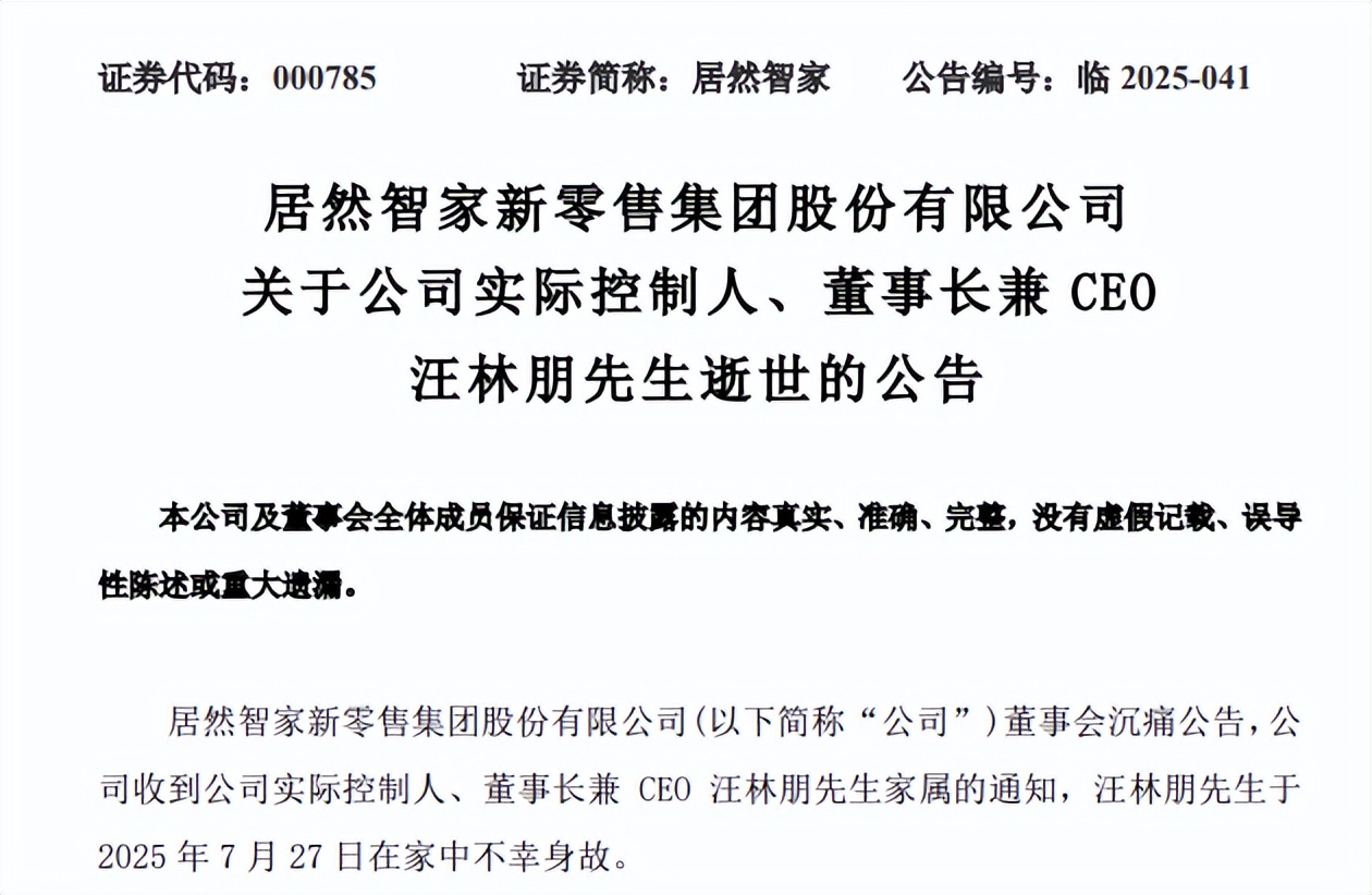 7月28日晚,居然智家公告称,实际控制人、董事长兼 CEO 汪林朋在家中不幸身故。