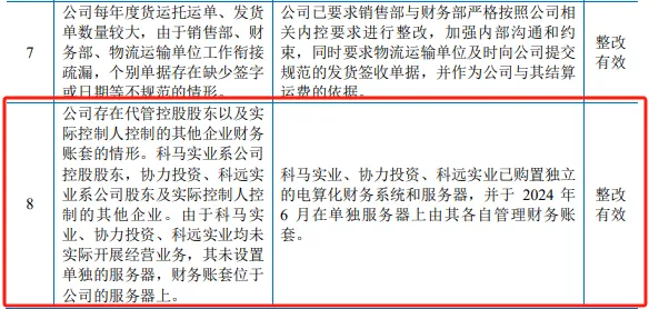 内控不规范。报告期内,科马材料存在研发管理、存货与销售管理、用印与合同管理、资金管理、财务内控、三会材料瑕疵等内控不规范情形,公司存在代管控股股东以及实际控制人控制的其他企业财务账套的情形,涉及企业包括科马实业、协力投资、科远实业。