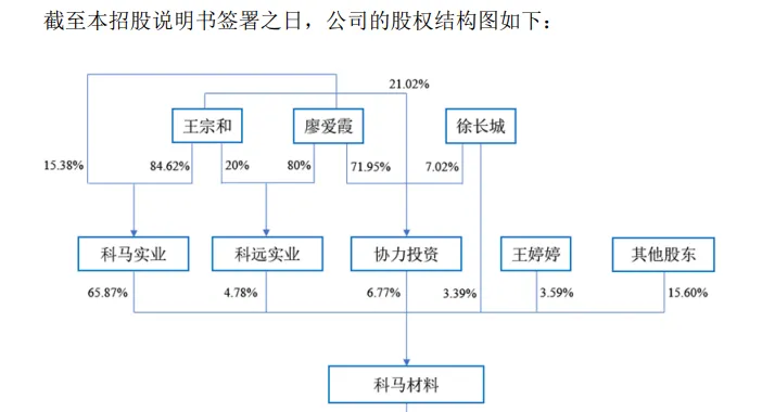 一家四口系实控人。科马材料的实际控制人是王宗和、廖爱霞、徐长城、王婷婷,合计控制比例为84.4%,其中王宗和、廖爱霞系夫妻关系,通过科马实业(控股股东)、科远实业、协力投资分别控制公司65.87%、4.78%、6.77%股权。