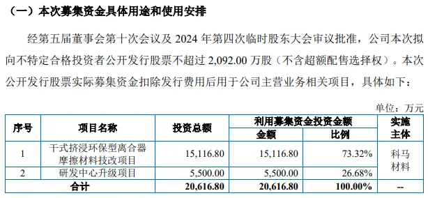 据短平快解读了解,本次IPO,科马材料拟向不特定合格投资者公开发行股票不超过2,092.00万股,拟募集资金20,616.80万元,用于干式挤浸环保型离合器摩擦材料技改项目(干式摩擦材料技改项目)以及研发中心升级项目,拟投入募集资金分别为15,116.80万元、5,500.00万元。