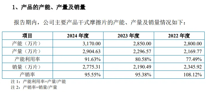 最近三年,科马材料干式摩擦片的产能利用率分别为77.49%、80.58%、91.63%,期末产能为3,170万片,即本次募投项目新增30%左右的产能。