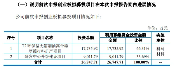 此前创业板申报终止。科马材料前次申报创业板拟募集26,747.71万元投向T2扩产与研发中心升级建设项目,并计划在募集资金到位前以自有资金先行投入建设,北交所在问询中要求公司说明该项目进展情况以及与本次募投项目的关系。