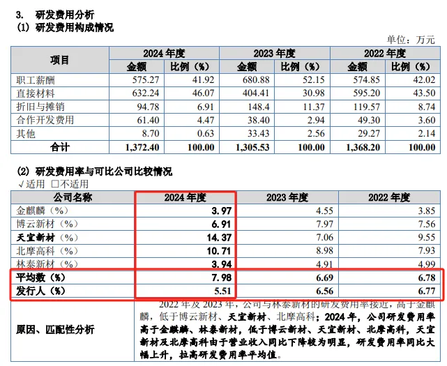 对比同行,可比同行研发费用率均值分别为6.78%、6.69%、7.98%,均超过公司,在2024年,博云新材、天宜新材、北摩高科的研发费用率分别为6.91%、14.37%、10.71%,高于公司;而金麒麟、林泰新材分别为3.97%、3.94%,落后于公司。