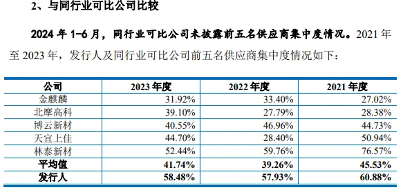 对比来看,公司前五大供应商集中度远超行业均值,可比同行2022年、2023年采购额占比分别为39.26%、41.74%,在2023年,金麒麟、北摩高科、博云新材、天宜上佳、林泰新材向前五大供应商采购比例分别为31.92%、39.1%、40.55%、44.7%、52.44%。
