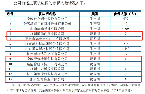 据问询函,公司列举出的13家主要供应商中7家供应商参保人数为个位数,包括杭州鹏扬商贸有限公司、嘉兴市海洋石油化工有限公司、宁波元恒橡塑科技有限公司、斯能橡胶(杭州)有限公司、杭州中宏橡胶有限公司、杭州铭源橡胶科技有限公司、浙江汇海实业有限公司,参保人数分别为2人、1人、4人、1人、4人、7人、6人。