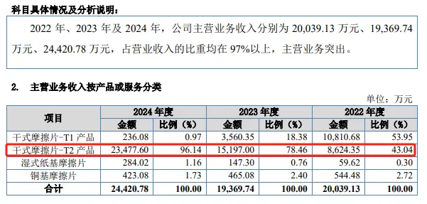 存在大单品依赖。科马材料的收入主要由干式摩擦片-T2产品贡献,最近三年分别为0.86亿元、1.52亿元、2.35亿元,占比从43.04%上升至96.14%;而干式摩擦片-T1产品收入则迅速下滑,分别为1.08亿元、0.36亿元、236.08万元,占比从53.95%下滑至0.97%。
