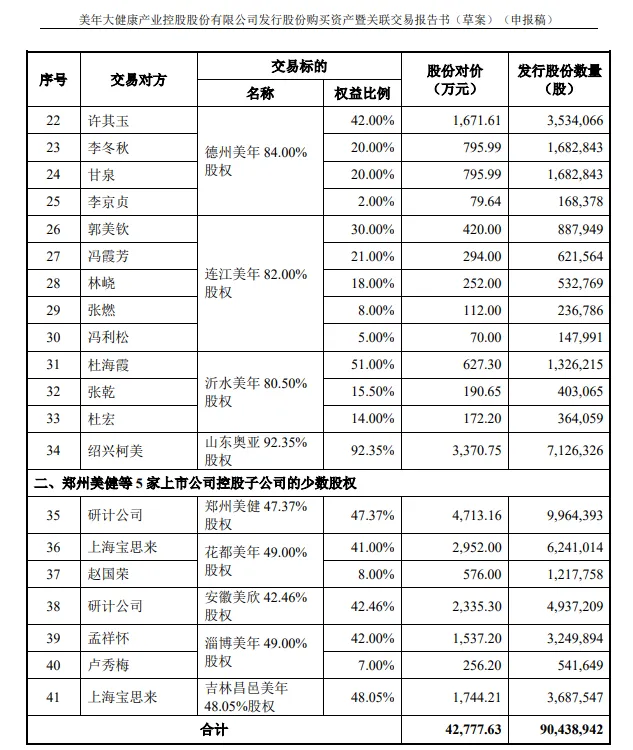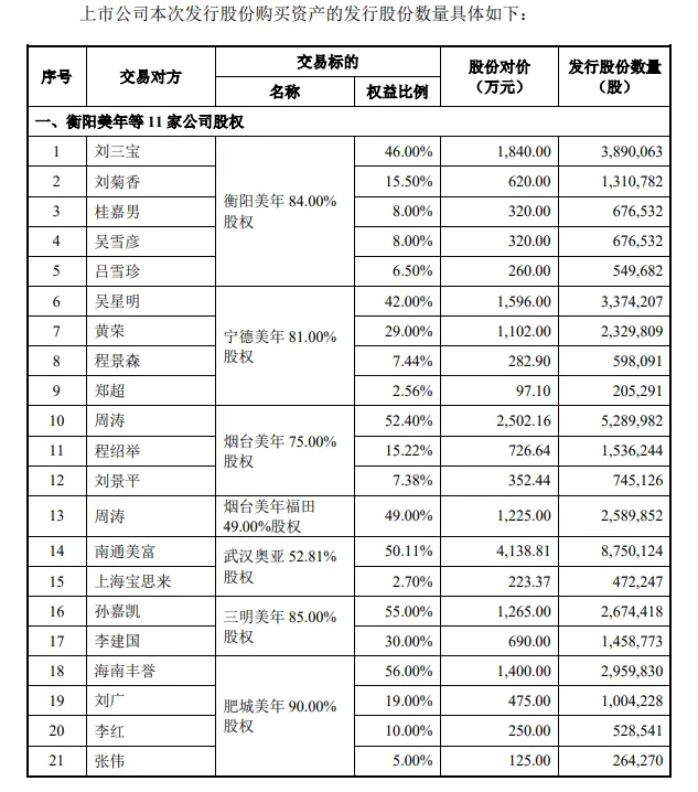美年健康本次拟发行股份收购衡阳美年84.00%股权、宁德美年81.00%股权、烟台美年75.00%股权、烟台美年福田49.00%股权、武汉美慈奥亚52.81%股权、三明美年85.00%股权、肥城美年90.00%股权、德州美年84.00%股权、连江美年82.00%股权、沂水美年80.50%股权、山东美铭奥亚92.35%股权等11家公司大部分股权。