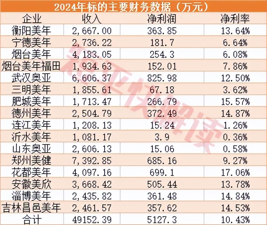 2024年,烟台美年、沂水美年、三明美年、山东奥亚实现营业收入分别为4,183.05万元、1,081.17万元、1,855.61万元、2,606.13万元、净利润分别为254.30万元、3.90万元、67.18万元、15.06万元,对应的净利率分别为6.08%、0.36%、3.62%、0.58%,均不及均值。