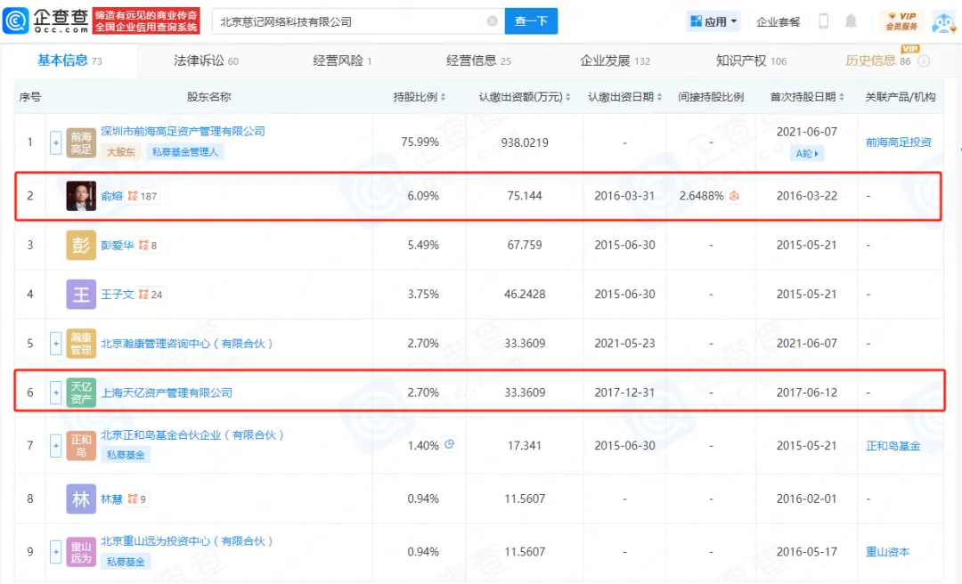 企查查显示,北京慈记、好医通都已经被限制高消费,美年健康实际控制人俞熔是北京慈记大股东之一,直接、间接持股比例分别为6.09%、2.65%。