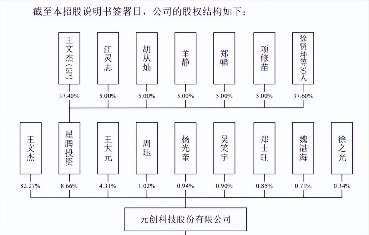 王文杰表决权超高。元创股份的控股股东、实际控制人是王文杰,直接持有公司82.27%的股份,通过担任星腾投资执行事务合伙人控制公司8.66%的股份,合计控制公司90.03%的股份。