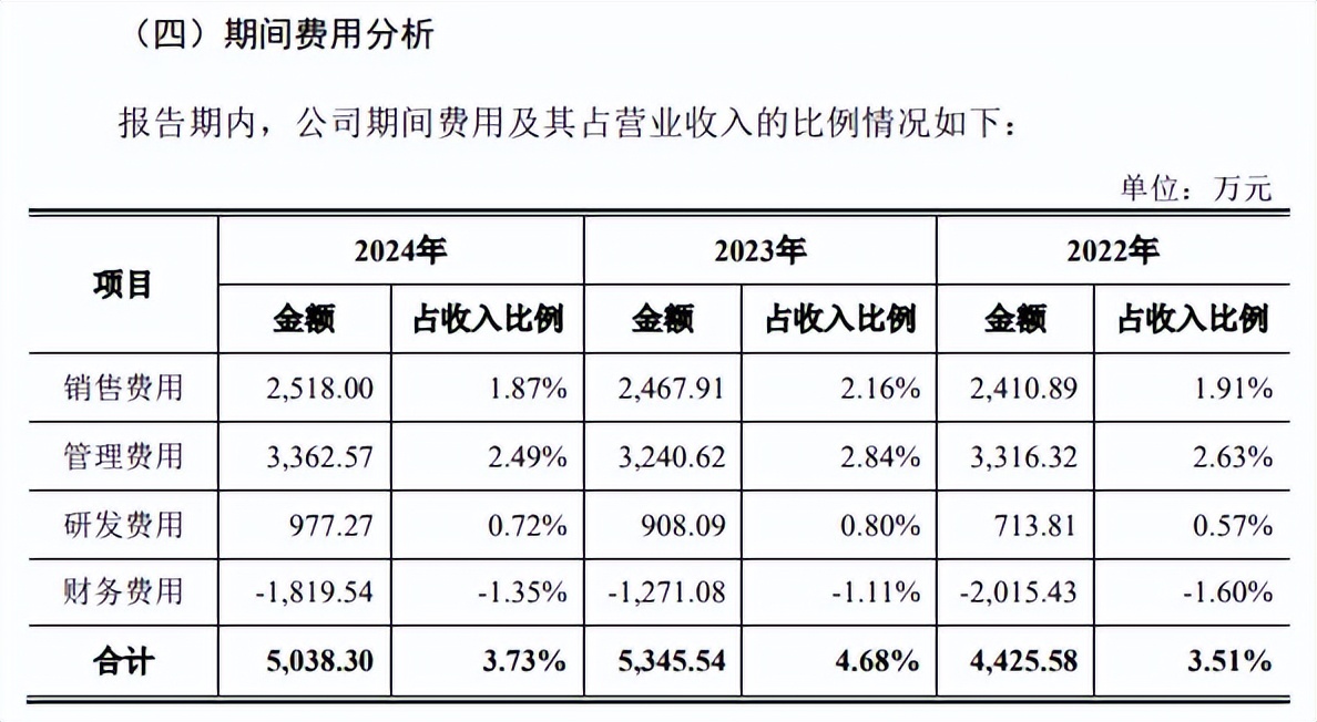 对比自身,销售费用、管理费用报告期内均超过研发费用,2024年分别为2,518.00万元、3,362.57万元,对应的费用率分别为1.87%、2.49%。
