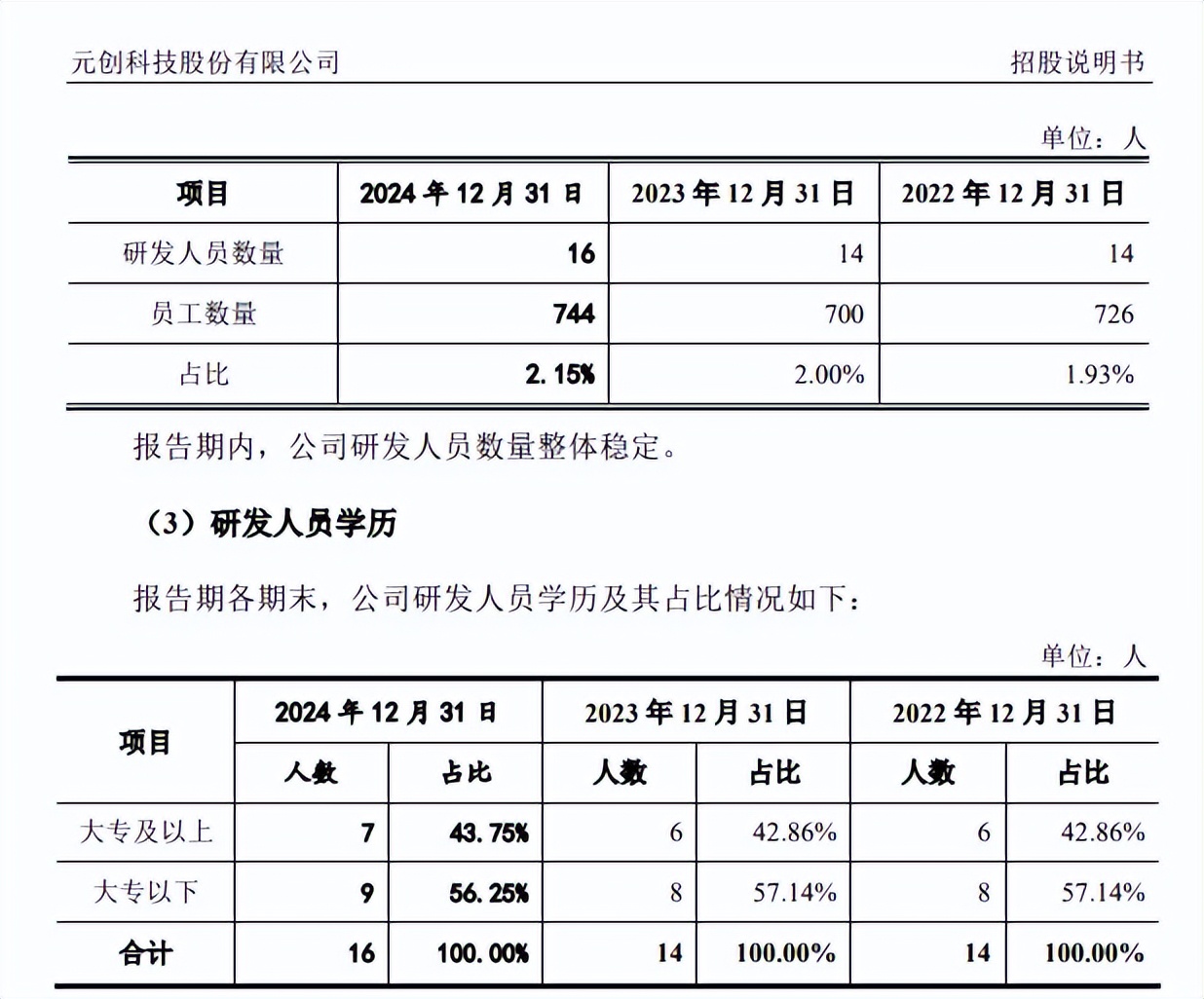 最近三年,公司研发人员数量分别为14人、14人、16人,占比分别为1.93%、2%、2.15%,研发人员以大专以下为主,2024年占比56.25%,大专及以上占比43.75%,就是不知道有多少本科、硕士的研发人员。