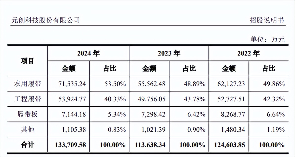 履带产品贡献超9成收入。元创股份收入主要来源于履带产品,2024年的收入12.55亿元,占比高达93.83%,该产品可以分为农用履带、工程履带,前者近三年收入分别为6.21亿元、5.56亿元、7.15亿元,占比从49.86%上升至53.5%,后者收入分别为5.27亿元、4.98亿元、5.39亿元,占比从42.32%下滑至40.33%。