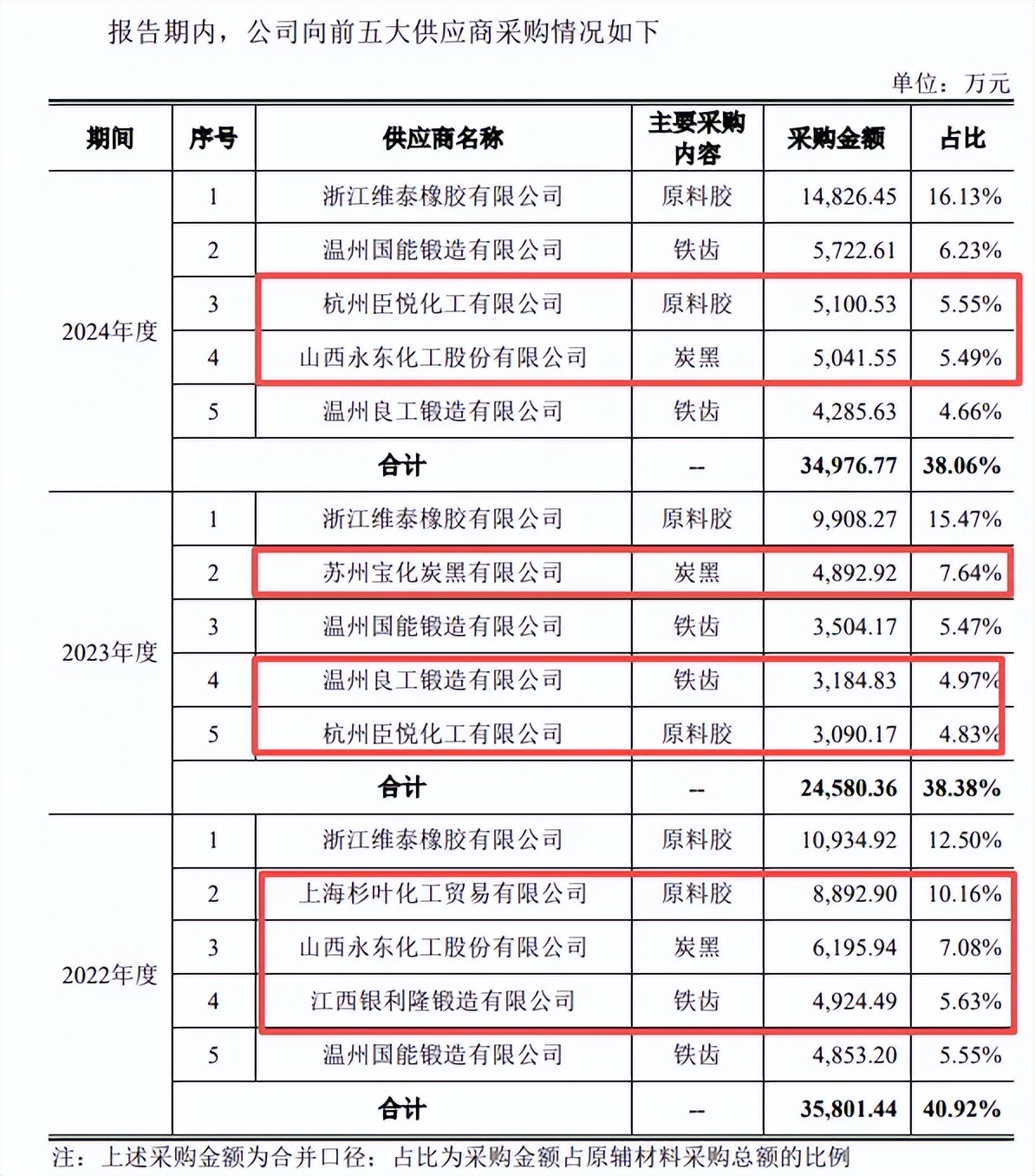 2024年,山西永东化工股份有限公司进入前五供应商行列,而苏州宝化炭黑有限公司则退出前五供应商之列。