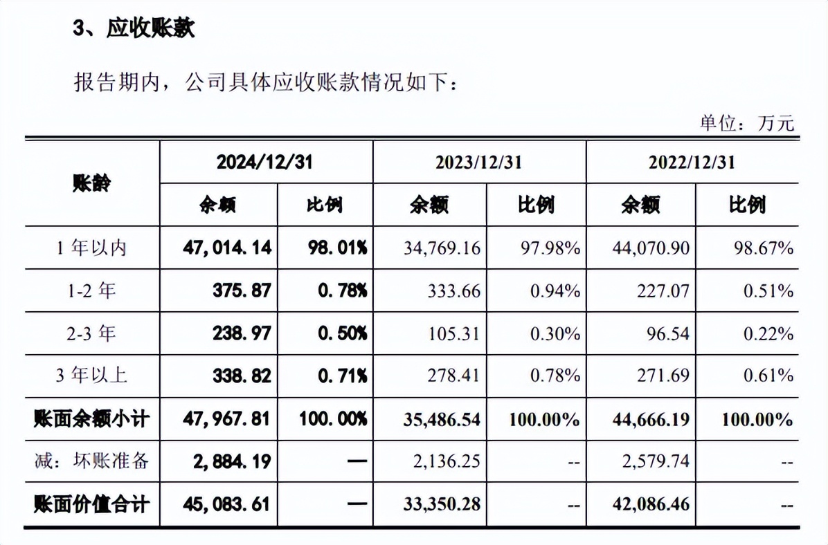 应收账款余额主要集中在前五名客户,近三年分别为2.99亿元、2.43亿元、3.43亿元,占比分别为66.9%、68.37%、71.59%,其中公司第一大客户沃得农机是应收账款第一欠款方款,分别为2.05亿元、1.51亿元、2.02亿元、占比分别为45.88%、42.42%、42.19%,这是需要引起注意的。