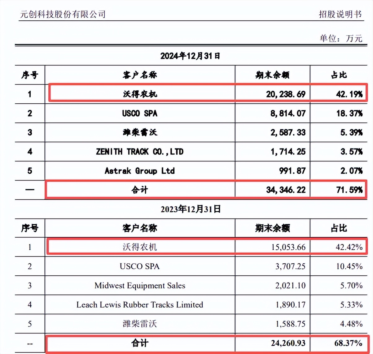 前五名客户贡献近五成收入。最近三年,元创股份对前五大客户的销售额分别为6.32亿元、5.31亿元、6.74亿元,占比分别为50.1%、46.56%、49.94%。其中沃得农机一直是公司第一大客户,销售额分别为2.84亿元、2.15亿元、3.27亿元,占比分别为22.54%、18.83%、24.26%。