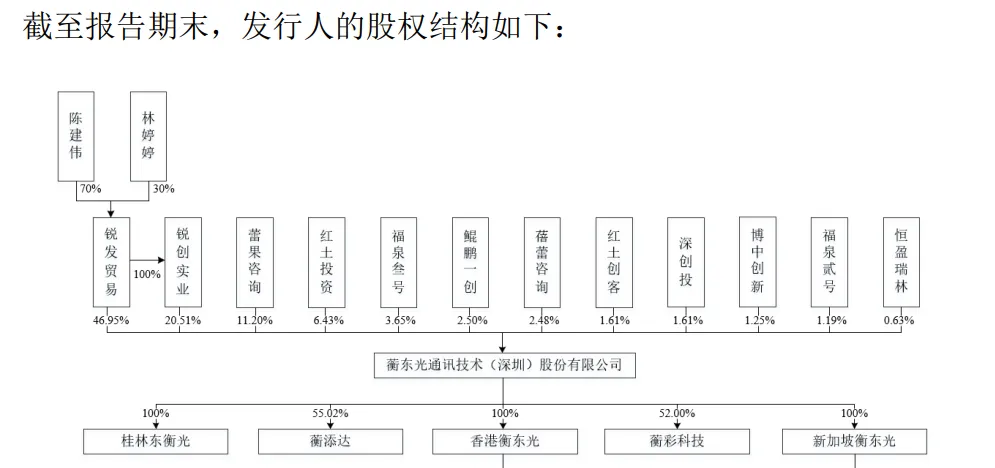 实控人表决权超65%。蘅东光控股股东为锐发贸易,直接持股比例44.76%,通过锐创实业间接持股20.51%,合计持有公司65.27%的股权,实际控制人是陈建伟,其通过锐发贸易、锐创实业间接持股比例分别为31.33%、14.35%,合计持股比例45.69%,合计控制公司65.27%的表决权。