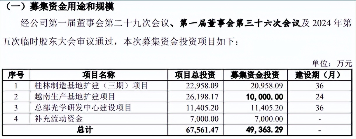 据短平快解读了解,本次IPO,蘅东光拟向不特定合格投资者公开发行股票不超过1,927.3850万股,拟募集资金49,363.29万元,用于桂林制造基地扩建(三期)项目、越南生产基地扩建项目、总部光学研发中心建设项目以及补充流动资金项目,拟投入募集资金分别为20,958.09万元、10,000.00万元、11,405.20万元、7,000.00万元。