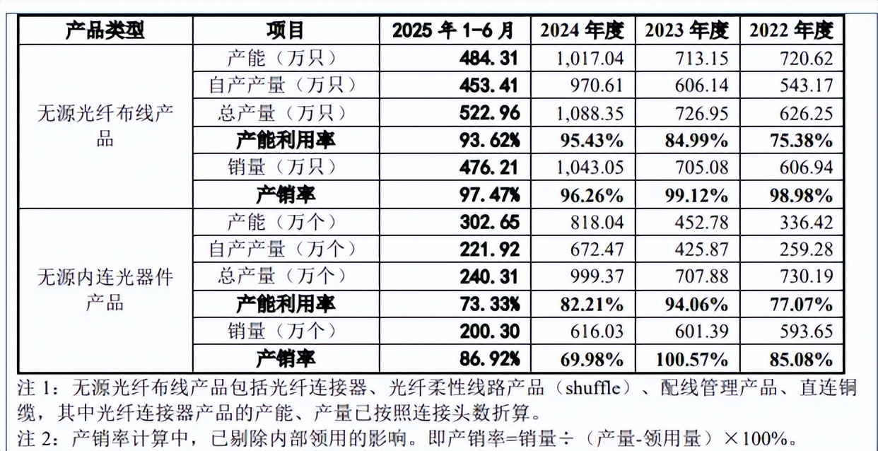 2022年至2024年,及2025上半年,无源光纤布线产品的产能利用率波动较大,分别为98.14%、75.38%、84.99%、99.51%;无源内连光器件产品的产能利用率同样波动大,分别为105.71%、77.07%、94.06%、74.48%。