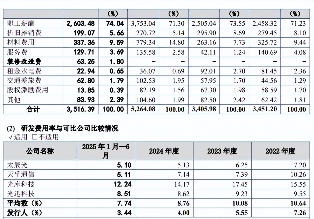 对比来看,同时期可比同行的研发费用率均值分别为10.64%、10.08%、8.76%、7.74%,报告期内,可比同行的研发费用率均高于公司,以2024年为例,太辰光、天孚通信、光库科技、光迅科技分别为5.13%、7.14%、14.17%、8.62%,公司称差异主要受各公司发展规模、发展阶段不同所致。