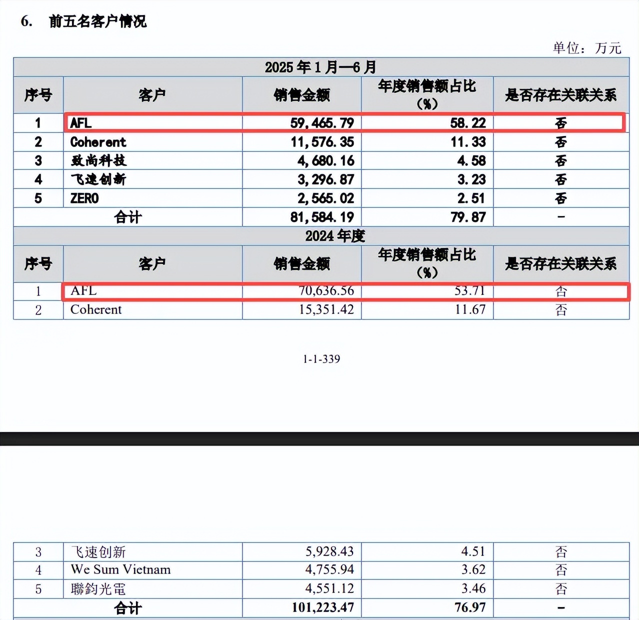 最近三年、及今年上半年,公司对前五大客户的销售额分别为3.17亿元、4.16亿元、10.12亿元、8.16亿元,占比分别为66.74%、67.85%、76.97%、79.87%。销售额主要来源于客户AFL,分别为1.65亿元、2.68亿元、7.06亿元、5.95亿元,占比分别为34.8%、43.64%、53.71%、58.22%。