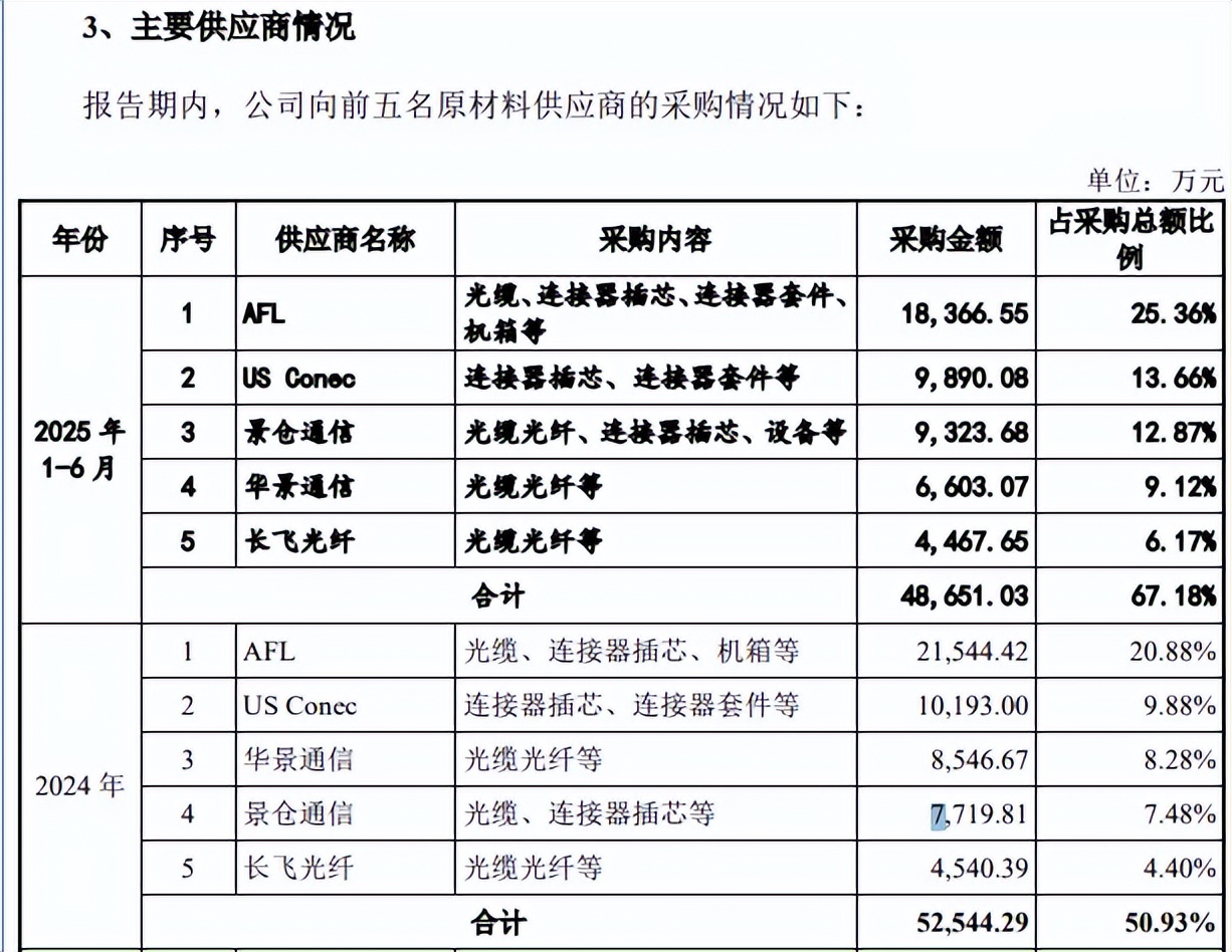 第一大客户也是第一大供应商。2023年,AFL成为蘅东光第二大供应商,采购额、占比分别为0.53亿元、13.64%,2024年及今年上半年跻身第一大供应商,采购额分别为2.15亿元、1.84亿元,占比分别为20.88%、25.36%,采购内容为光缆、连接器插芯、连接器套件、机箱等。