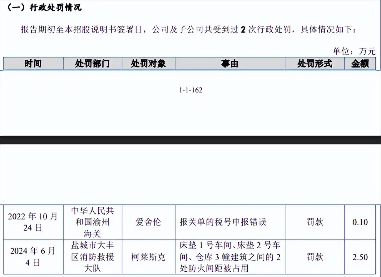 受到两次行政处罚。2022年10月24日,爱舍伦因报关单的税号申报错误,被渝州海关罚款0.1万元;2024年6月4日,柯莱斯克(子公司)床垫1号车间、床垫2号车间、仓库3幢建筑之间的2处防火间距被占用,被盐城市大丰区消防救援大队罚款2.5万元。