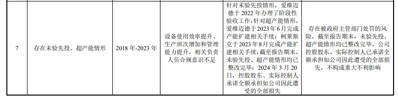 存在未验先投、超产能情形。2018年-2023年,因为设备使用效率提升、生产班次增加和管理能力提升,相关负责人员合规意识不足等原因,存在未验先投、超产能情形,针对前者,爱维迈德于2022年办理了阶段性验收工作;针对后者,爱维迈德于2023年6月完成产能扩建相关手续;柯莱斯克于2023年8月完成产能扩建相关手续,相关违规行为存在被政府主管部门处罚的风险。