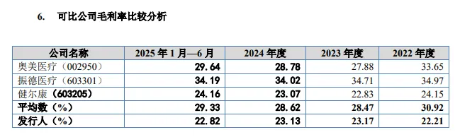 2024年,奥美医疗、振德医疗、健尔康毛利率分别为28.78%、34.02%、23.07%,均高于公司,主要系公司通过线下以OEM方式销售,销售资源倾向于大客户群体,优先满足核心客户订单,销售收入较为集中,外销占比较高,而振德医疗、奥美医疗均通过医院线和线上线下结合实现销售。