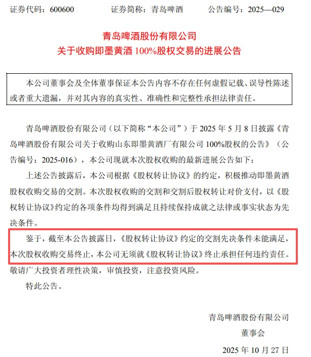10月27日,青岛啤酒公告收购即墨黄酒100%股权交易终止,原因是此前签署的《股权转让协议》约定的交割先决条件未能满足。