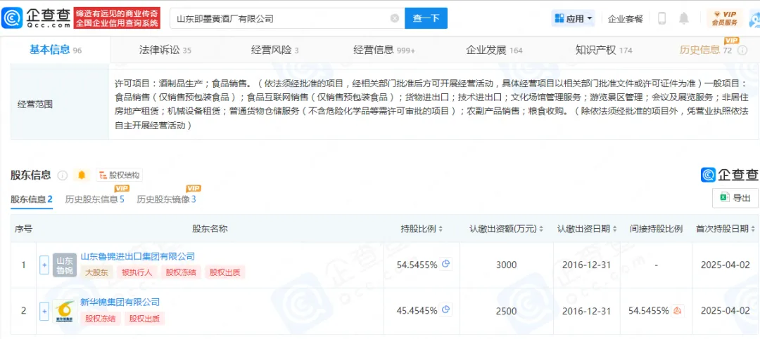 企查查显示,鲁锦集团、新华锦集团是即墨黄酒的两大股东,持股比例分别为54.55%、45.45%,其中新华锦集团持有鲁锦集团95%的股份,两大股东的情况并不算乐观,面临着较大财务压力,都存在股权冻结、股权出质,主要发生在9月份之后。