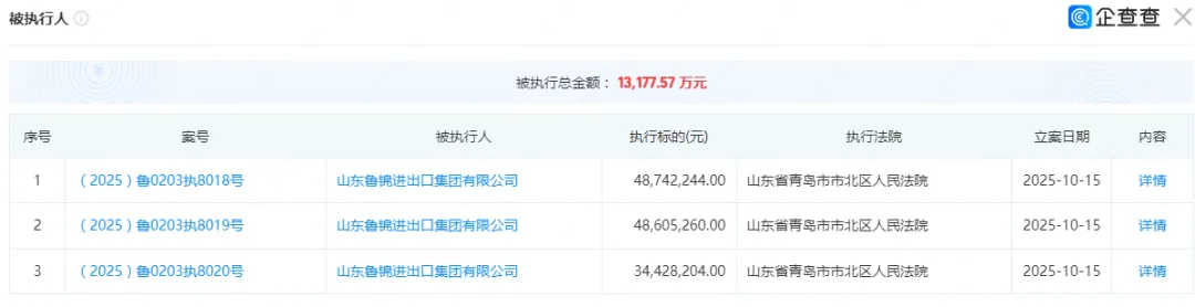 另外,鲁锦集团在10月15日还新增三则被执行人记录,被执行金额1.32亿元,执行法院是青岛市北区人民法院。