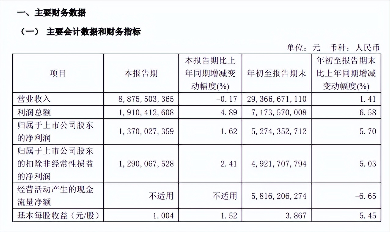 同时期归母净利润52.74亿元,同比增长5.7%,各季度分别为17.1亿元、21.94亿元、13.7亿元,同比分别增长7.08%、7.32%、1.62%。