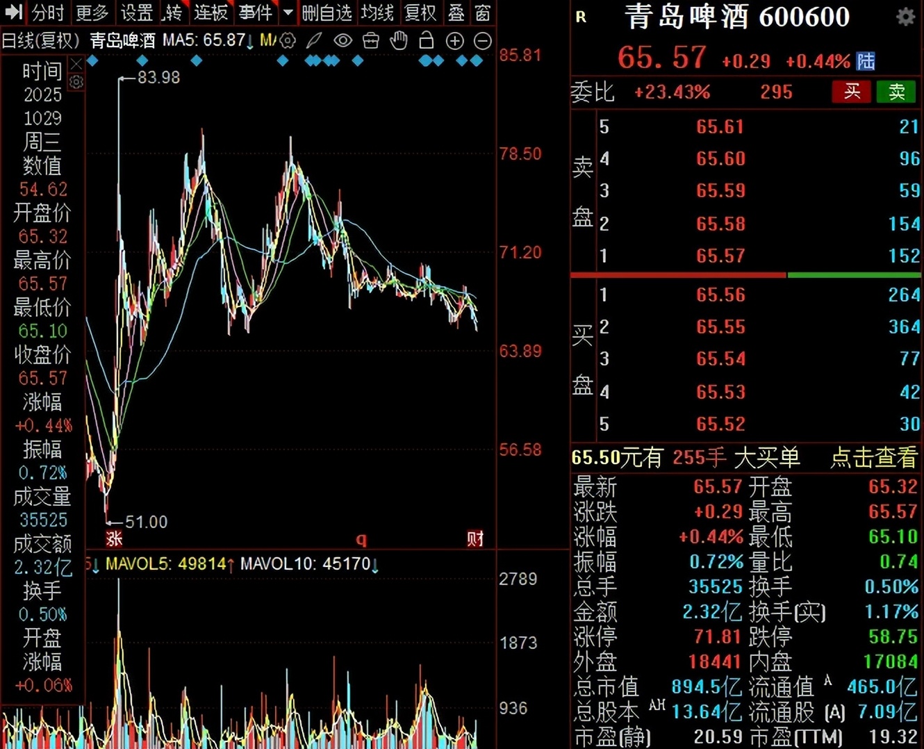 二级市场上,青岛啤酒股价波动较大,年初至今跌幅约17%,截至10月29日收盘,股价为65.57元/股(前复权,下同),较去年83.98元/股高点下跌约22%,总市值894.5亿元,TTM市盈率19.32倍。