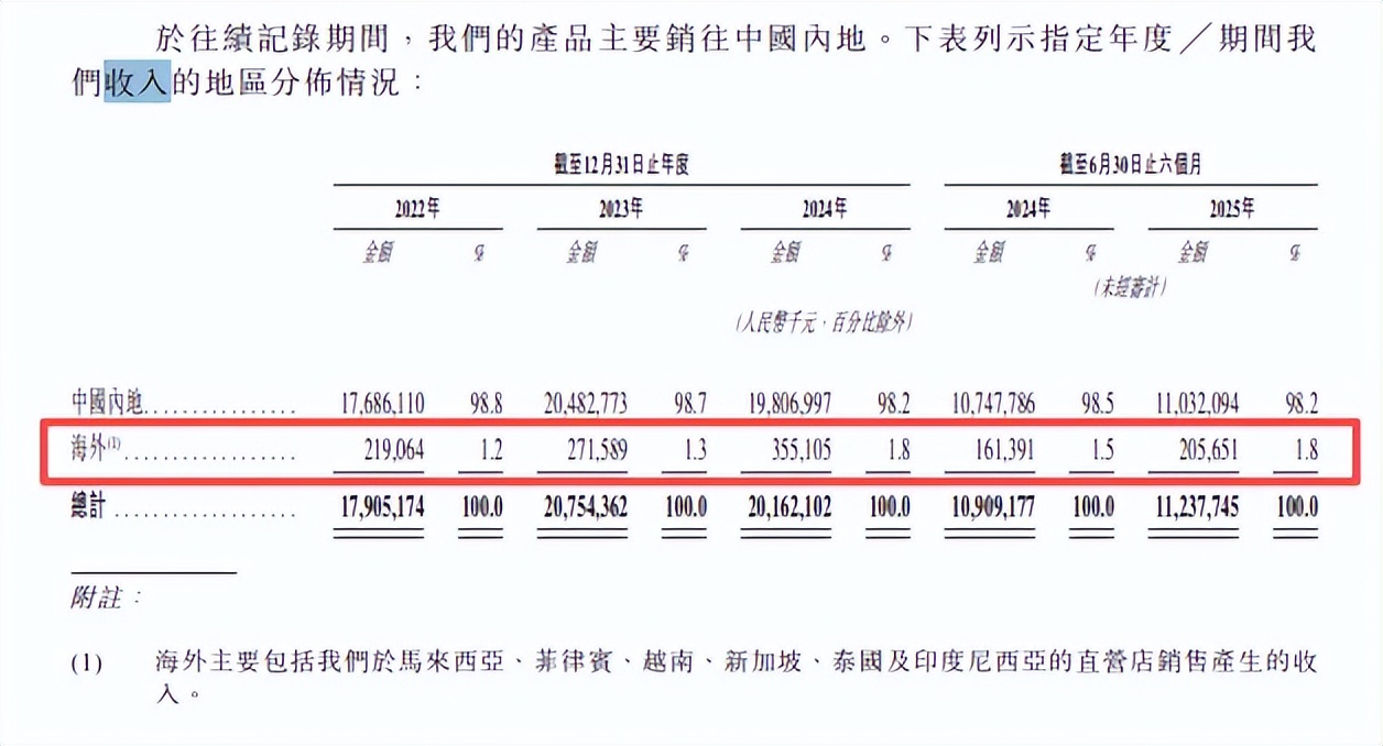 数据背后,公司高度依赖国内市场,2022年至2025年1-6月(报告期)的收入占比均在98%以上,2024年收入额、占比分别为198.07亿元、98.2%。不过,海外市场收入贡献占比明显偏低,同时期分别为1.2%、1.3%、1.8%、1.8%,2024年收入仅3.55亿元,仅相当于国内市场的零头,海外市场收入主要来源于马来西亚、菲律宾、越南、新加坡、泰国、印度尼西亚的直营店。