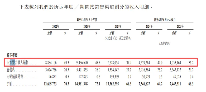 2022年至2024年,线下渠道向加盟合伙人销售金额分别为88.34亿元、94.37亿元、76.28亿元,2023年增速仅6.82%,2024年大跌19.17%,今年上半年维持下滑态势,收入为40.53亿元,同比减少5.26亿元,降幅11.49%。