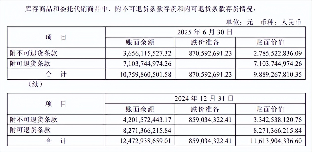 中报显示,附不可退货条款、附可退货条款的存货金额分别为36.56亿元、71.04亿元,前者跌价准备8.71亿元,后者则不产生跌价准备。当期存货跌价损失及合同履约成本减值损失为2.61亿元。