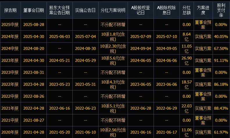 长期大手笔分红。虽然海澜之家很少将现金流用于购买理财产品,但分红力度却是十分给力,2020年至2023年分别分红11.06亿元、22.03亿元、18.57亿元、26.9亿元,股利支付率分别为61.97%、88.43%、86.18%、91.11%。2024年中报、年报分别分红11.05亿元、8.64亿元,合计19.69亿元,股利支付率91.2%。