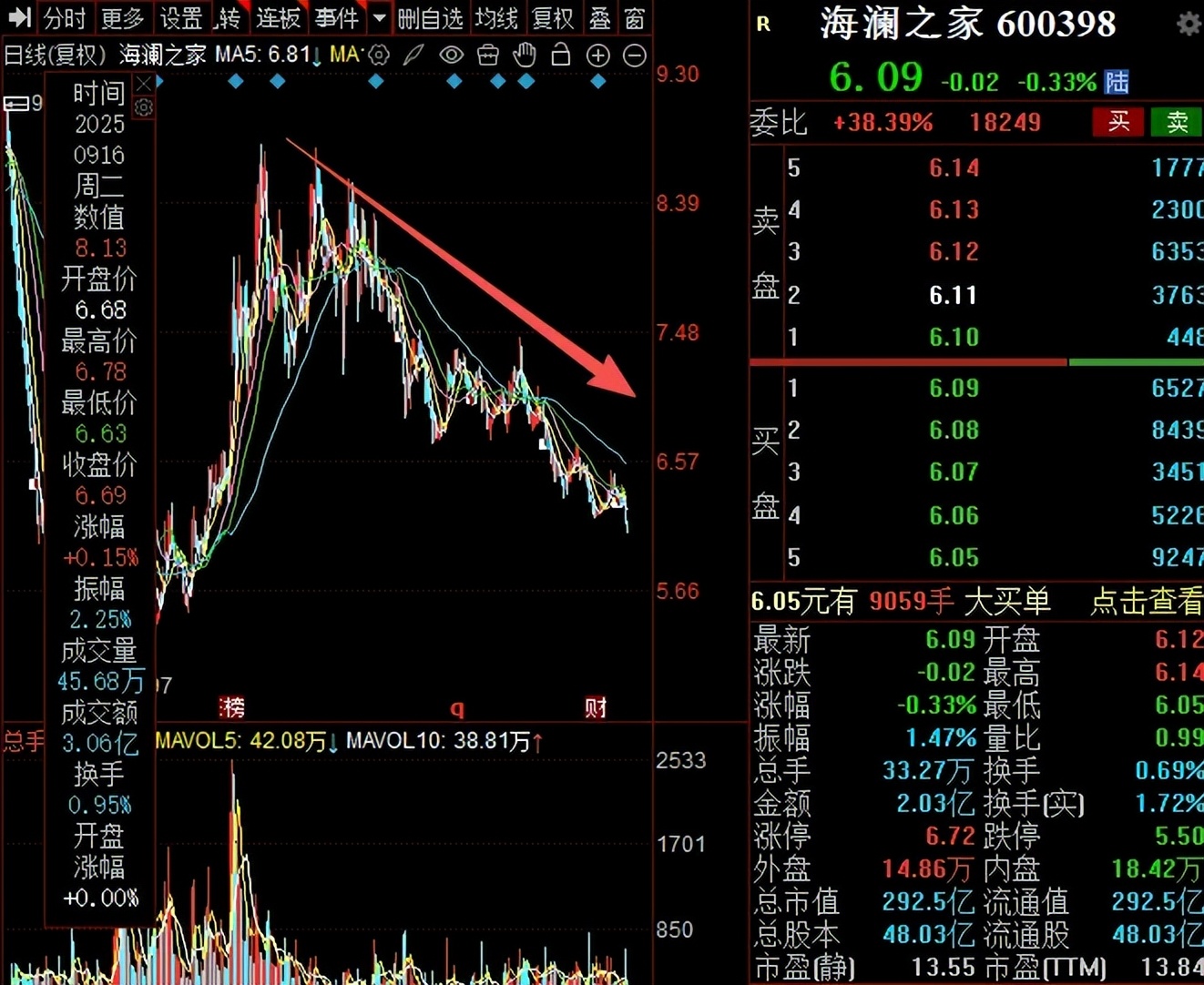 二级市场上,海澜之家股价从年初至今跌幅近17%,截至11月25日收盘,股价为6.09元/股(前复权,下同),较8.78元/股的高点下跌约三成,目前没有明显止跌迹象,总市值292.5亿元,TTM市盈率13.84倍。另外,国际指数编制公司MSCI在11月6日公布了2025年11月份指数审核结果,海澜之家等64家成分股遭剔除。