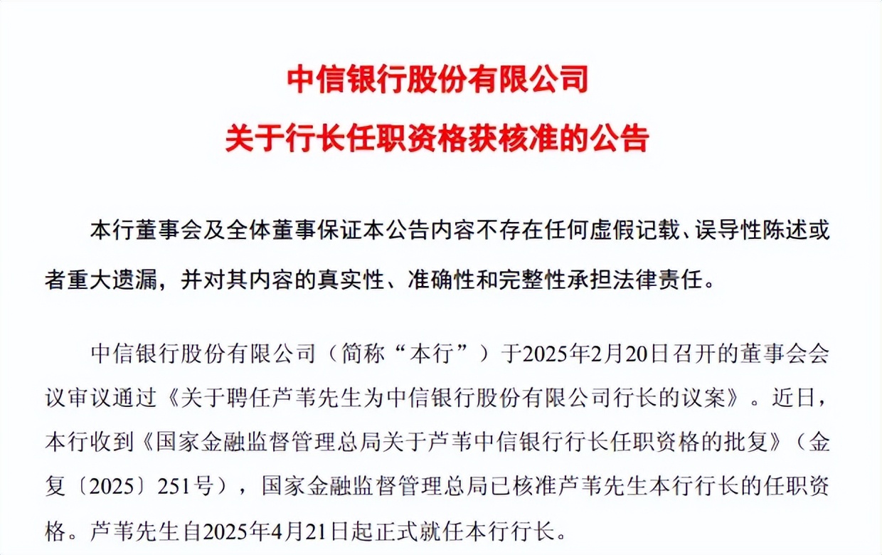2025年收官前夕,中信银行迎来重大人事变动,原行长芦苇因工作调整辞职,这距离其正式就任行长约8个多月,据悉其已被邮储银行聘任为行长,任职资格尚有待核准。去年2月,中信银行原行长刘成同样因工作调整而辞职,随后奔赴中信建投担任董事长职务。