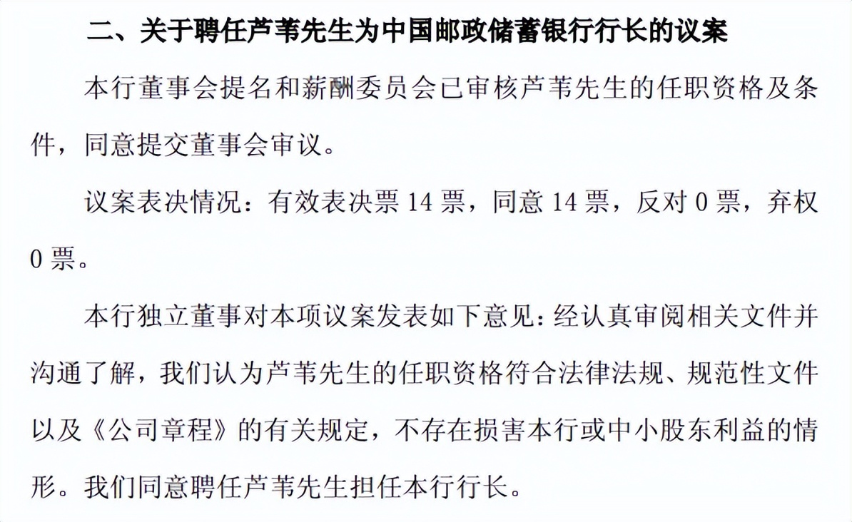 需要指出的是,本次辞职行长芦苇的去向已经确认,此前12月23日,中国邮政集团宣布芦苇任中国邮政集团副总经理、党组成员,当月26日,邮储银行董事会提名芦苇为执行董事候选人,还通过聘任其为行长的议案,任职资格尚待国家金融监督管理总局核准。