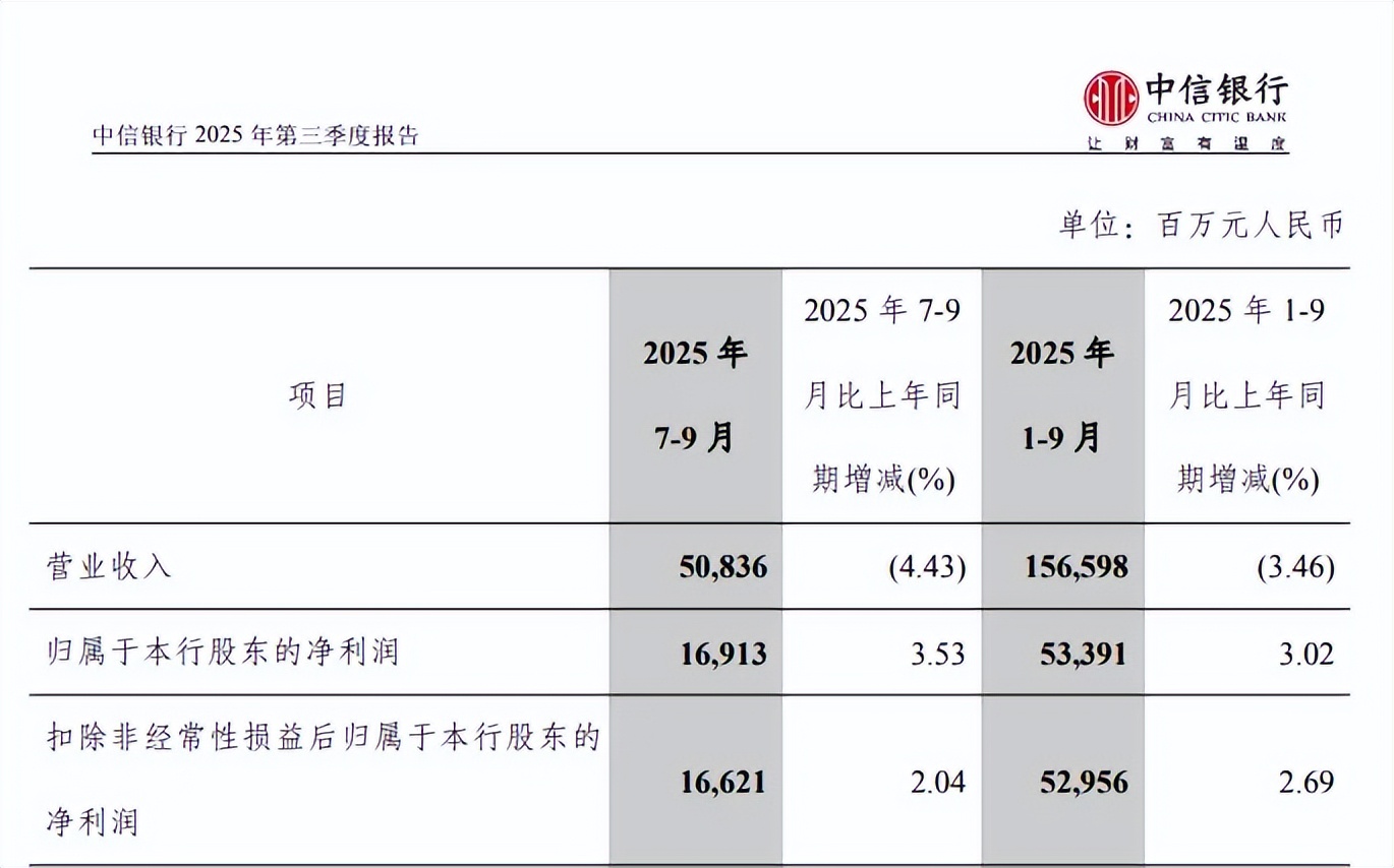 去年前三季度利息净收入、非利息收入双降。净息差不断下滑是银行业面临的现状,中信银行则从2020年的2.26%下滑至2024年的1.77%,2025年前三季度进一步下滑至1.63%,累计下滑0.63个百分点。