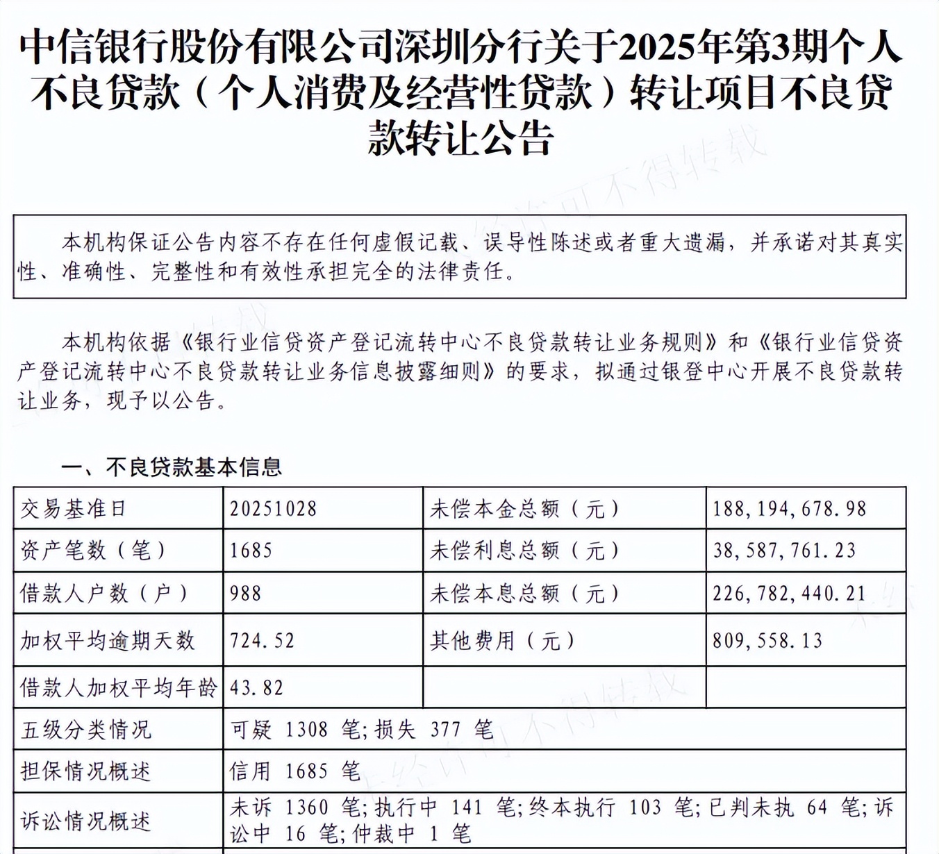 在2025年最后一个月,中信银行多家分行挂牌转让个人不良贷款,主要包括消费及经营性贷款两大类,涉及分行包括北京分行、上海分行、广州分行、深圳分行、南京分行、苏州分行、重庆分行、天津分行、宁波分行、厦门分行、宁波分行等等,未偿本息总额合计超16亿元。
