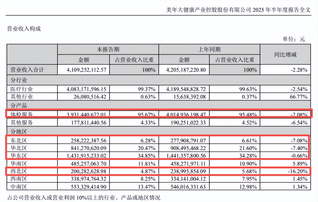 体检服务贡收超95%,过半地区收入下滑。据2025年中报,美年健康体检服务收入为39.31亿元,同比减少0.83亿元,降幅2.08%,该产品收入占比高达95.67%。